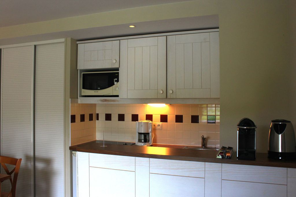 - Coin cuisine ouvert sur le séjour avec lave vaisselle, four micro onde, table vitro céramique, cafetière