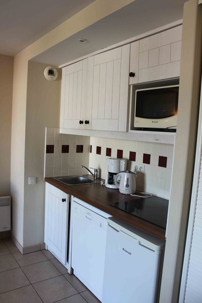 - Coin cuisine ouvert sur le séjour avec lave vaisselle, four micro onde, table vitro céramique, cafetière